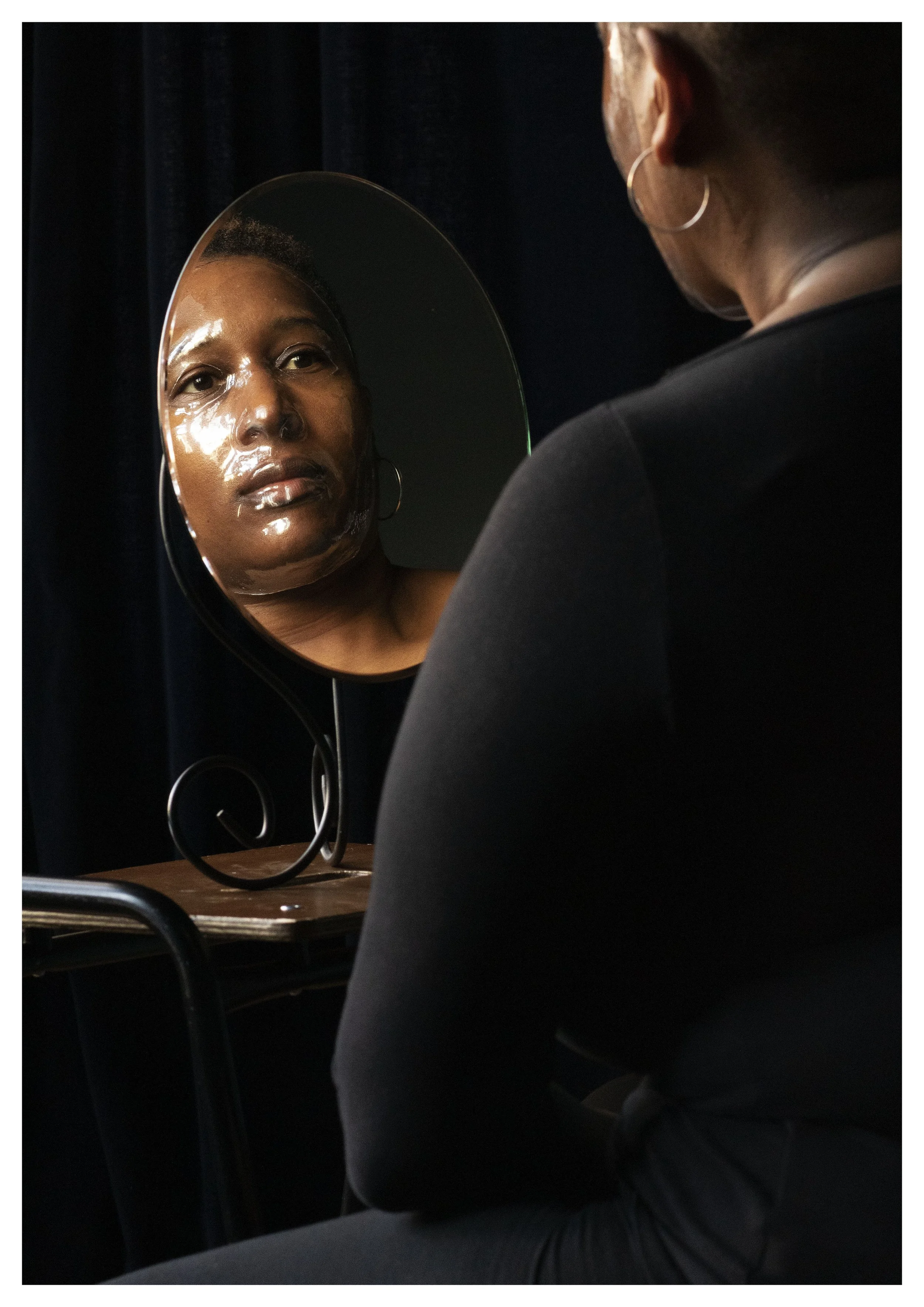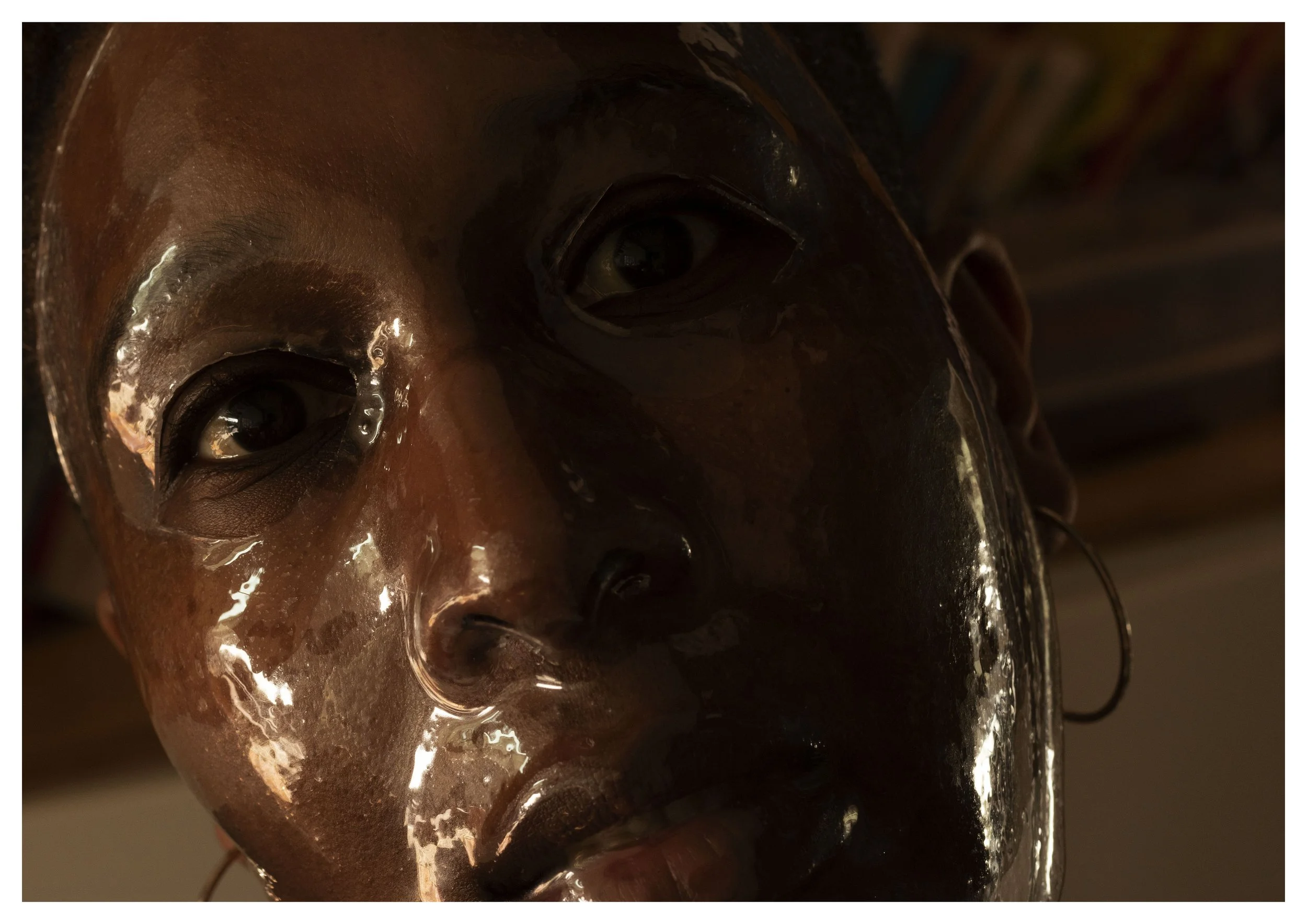 However in doing so I came to realise that feelings of loneliness are universal, most people I have spoken to about the project can relate to it in some aspect of their life. But may not necessarily have used the term loneliness to describe their feelings until our conversation. Part of my loneliness comes from feeling unseen and unheard my mask invites the viewer to see and hear me. Whilst masks are primarily seen as a tool for concealment, I have chosen to use a mask as an act of revelation asserting my identity, my sense of belonging. An act to renounce the societal invisibility, associated with many of the masks I have been given. I cover my face not to hide but to be seen. In addition the opaque and shiny property of the mask acts as both a tool for concealment and as a reason to look more closely.